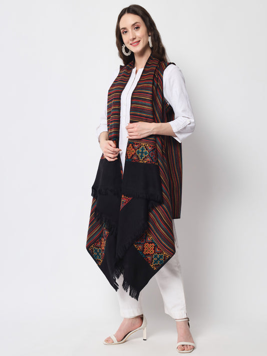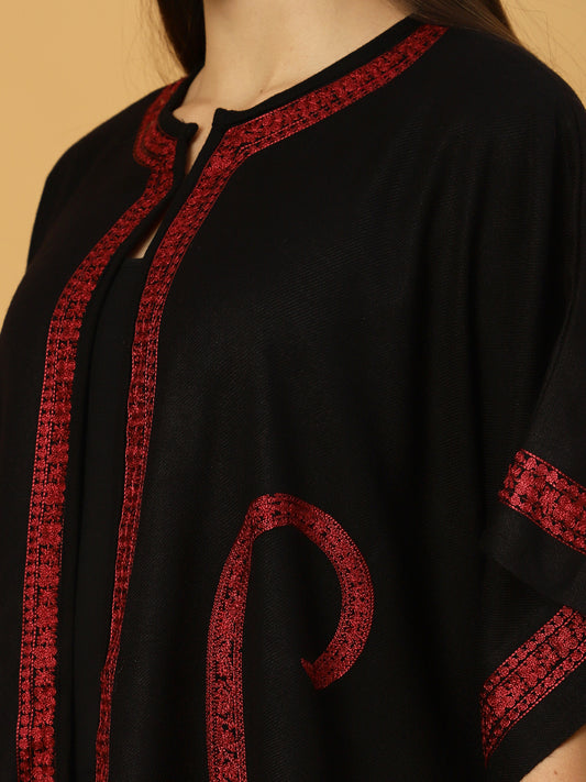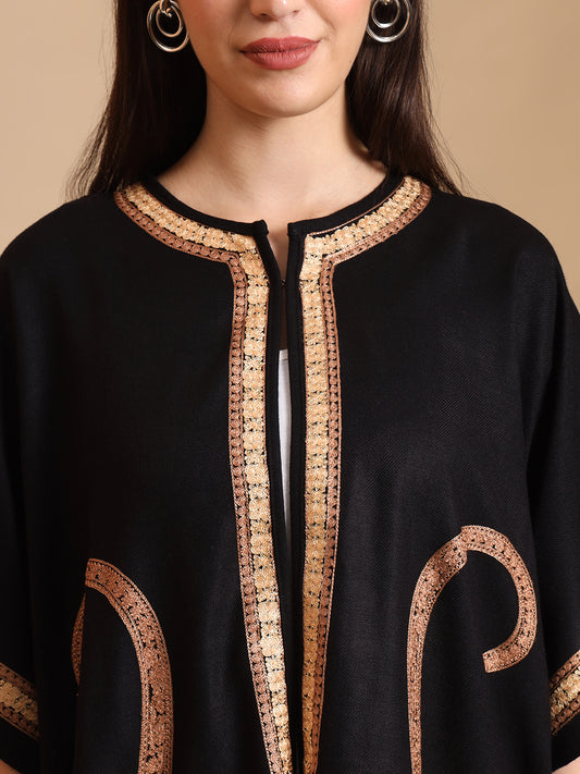Woollen Poncho with Kashmiri Embroidery and Silk Lining | Black