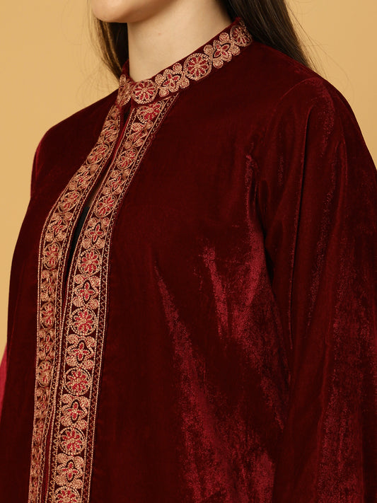 Women's Velvet Cape Shrug with Embroidery on Neck and Borders | Maroon