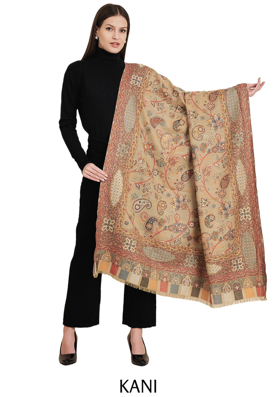 Two Tone Kani Weave Floral Motif Pure Wool Shawl For Women | Black Beige