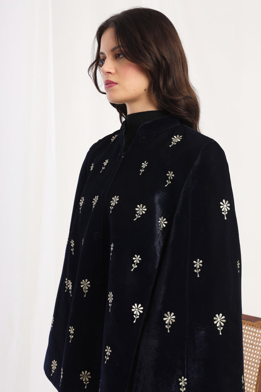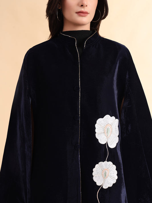 Velvet Floral Embroidered Blue Cape Jacket | Blue