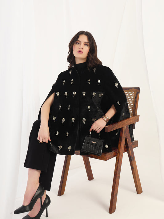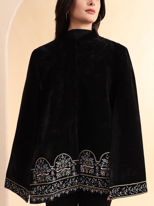 Velvet Floral Embroidered Black Cape Jacket | Black