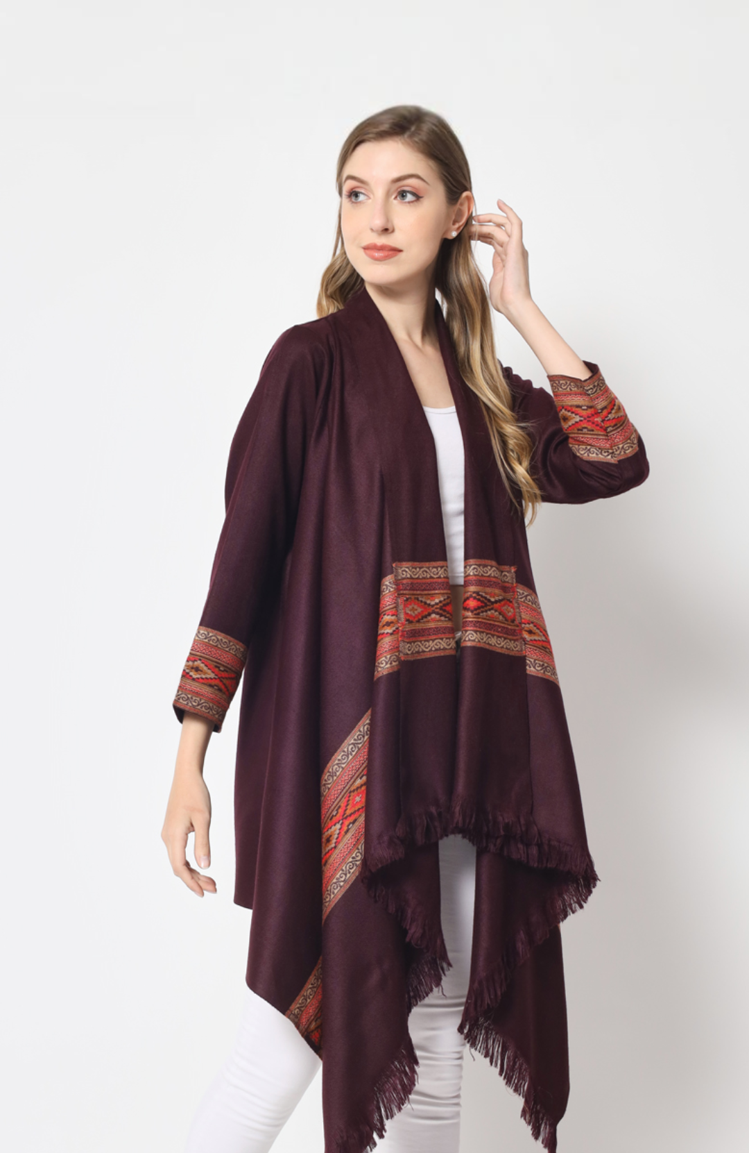 Women's Woven Cape Shrug in Himalayan Stripes | Maroon