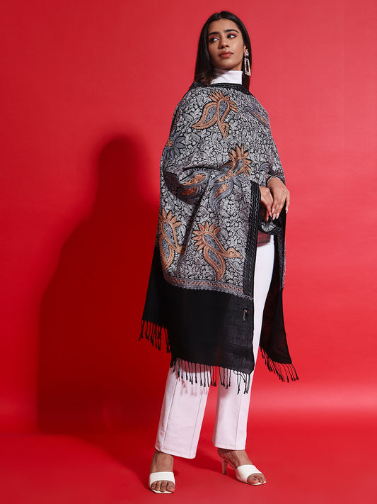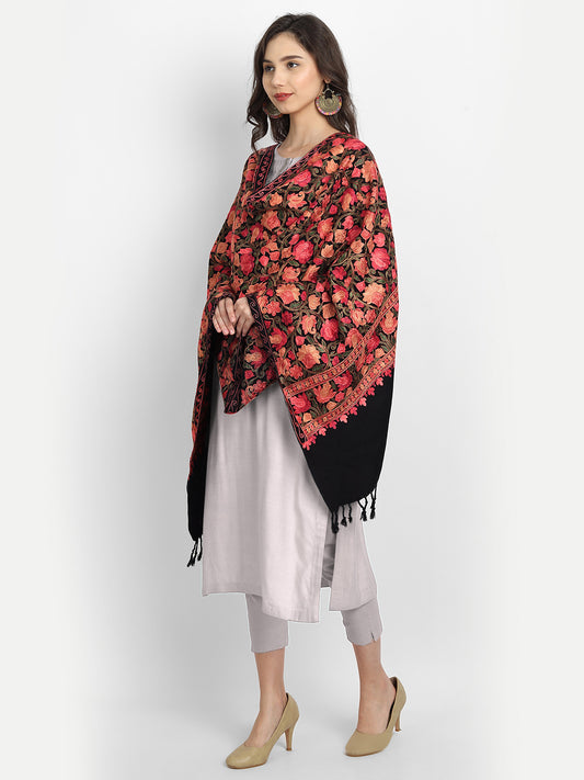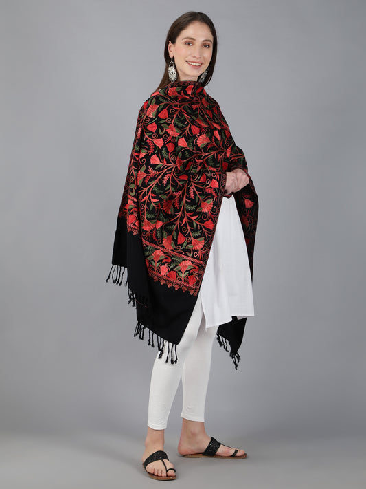 Woollen Pashmina Feel Stole in Silk Embroidery for Women | Black