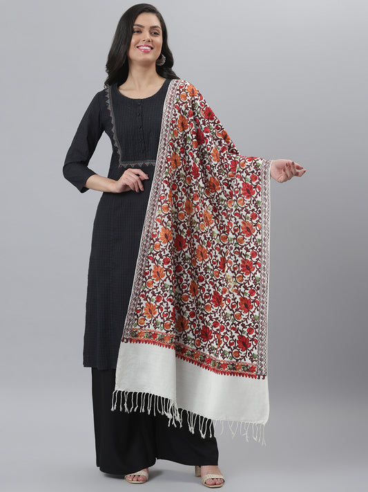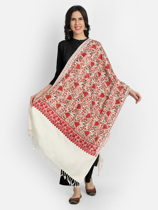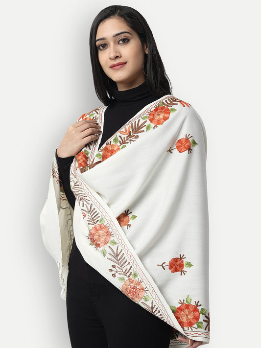 Women Kashmiri Aari Embroidered Woollen Stole | White