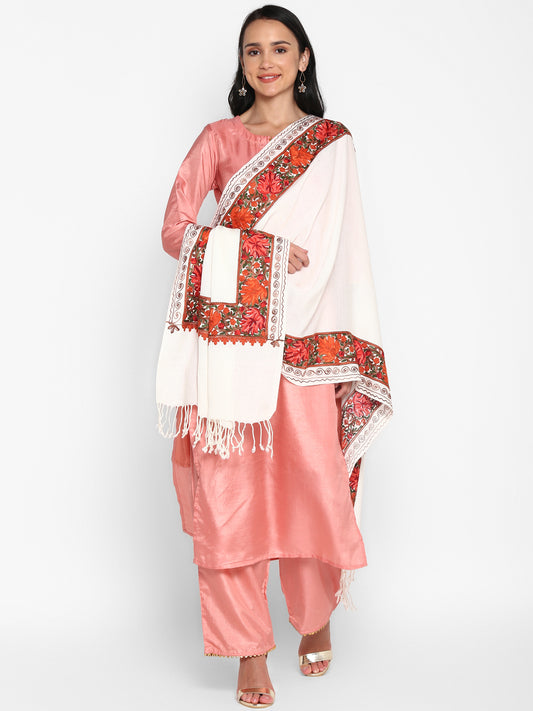 Woollen Pashmina Feel Stole in Silk Embroidery for Women | White