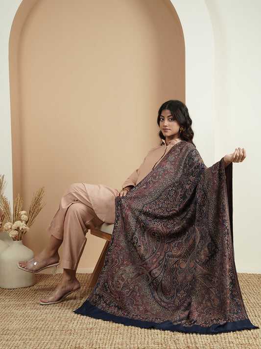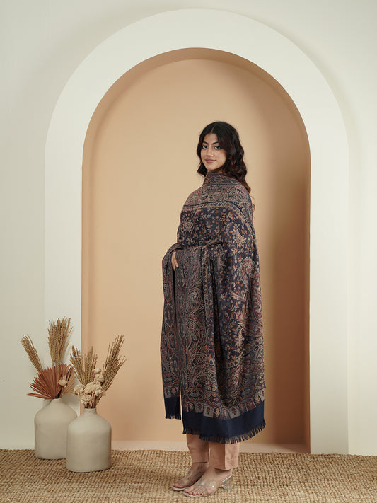 Warm Faux Pashmina Jacquard Woven Jamawar Mughal Shawl (Navy Blue)