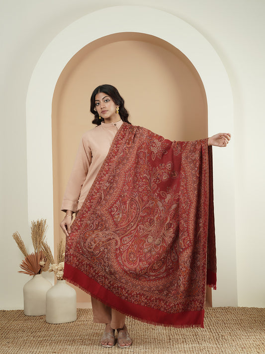 Woolen Kani Shawl with Intricate Kashmiri Paisley & Floral Woven Design (Wine)