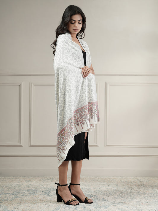 Kani Weave Floral Jaal Pattern Shawl For Women | White