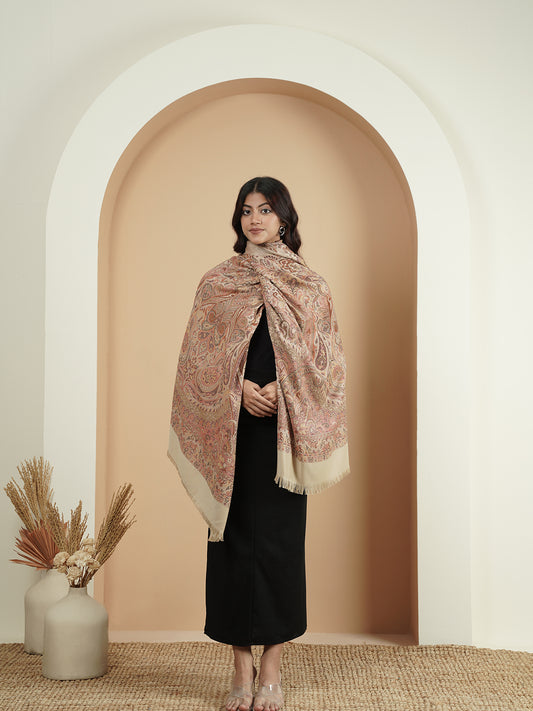 Warm Faux Pashmina Jacquard Woven Jamawar Mughal Shawl (Beige)