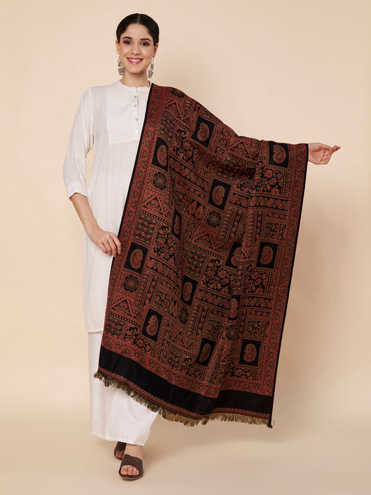 Warm Faux Pashmina Floral Jacquard Woven Jamawar Shawl (Black)