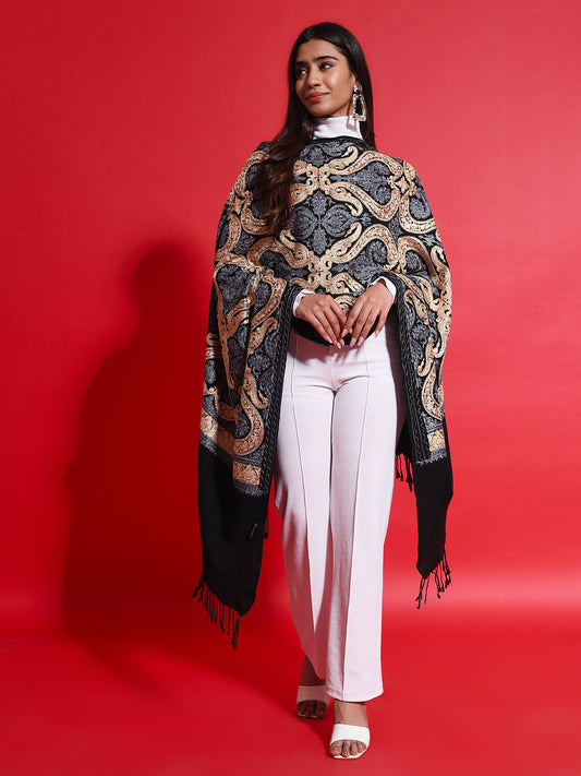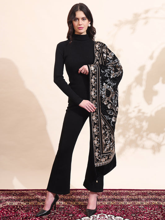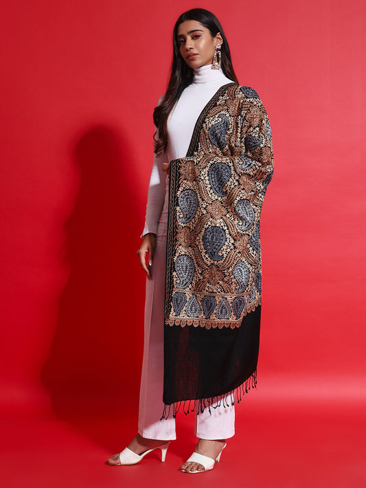 Woollen Pashmina Feel Royal Stole in Silk Embroidery Dense Jaal for Women | Black