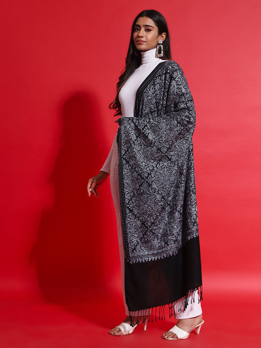 Woollen Pashmina Feel Stole in Silk Embroidery Dense Jaal for Women | Black