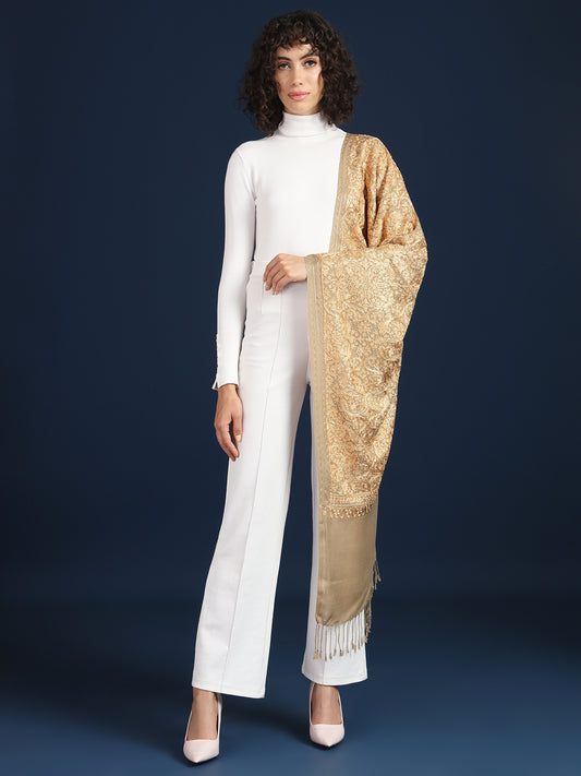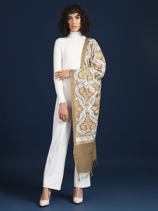 Woollen Pashmina Feel Royal Stole in Silk Embroidery Dense Jaal for Women | Brown