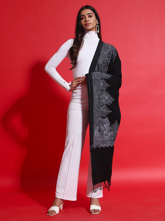 Woollen Pashmina Feel Stole in Silk Embroidery for Women | Black