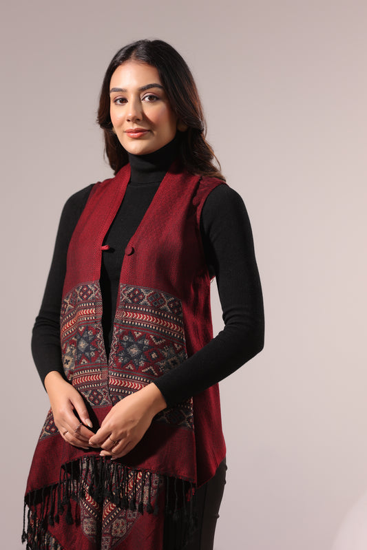Women's Sleeveless Kullu Pattern Shrug Cardigan | Maroon