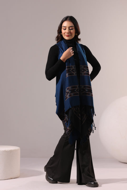 Women's Sleeveless Kullu Pattern Shrug Cardigan | Blue