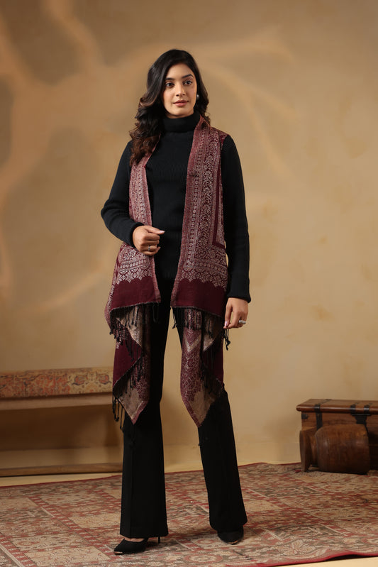 Women's Sleeveless Zari Pattern Shrug Cardigan | Wine