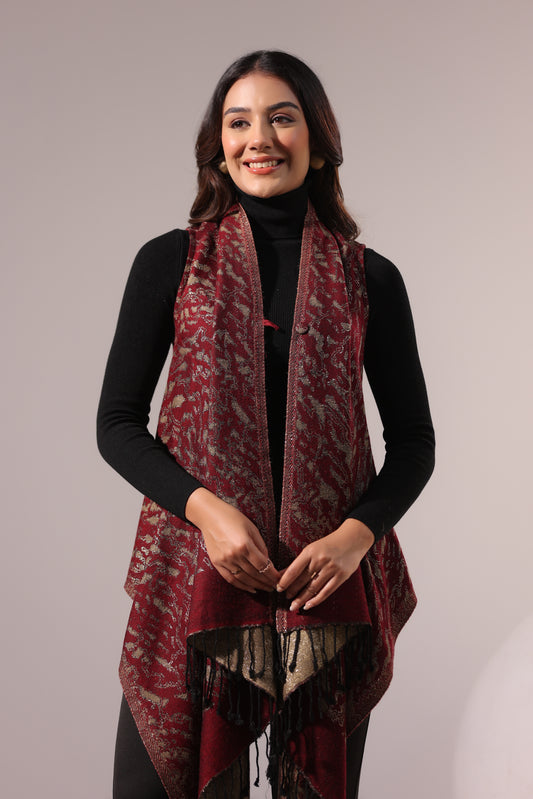 Women's Sleeveless Zari Pattern Shrug Cardigan | Maroon
