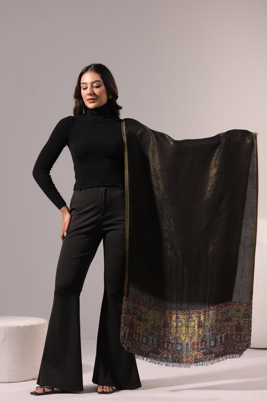 Women’s Premium Kani Woven Shawl with Zari Sheen | Gold Black