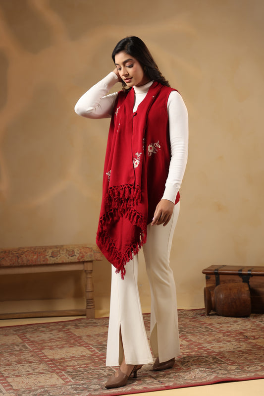 Women's Sleeveless Floral Zari Embroidery Shrug Cardigan | Red