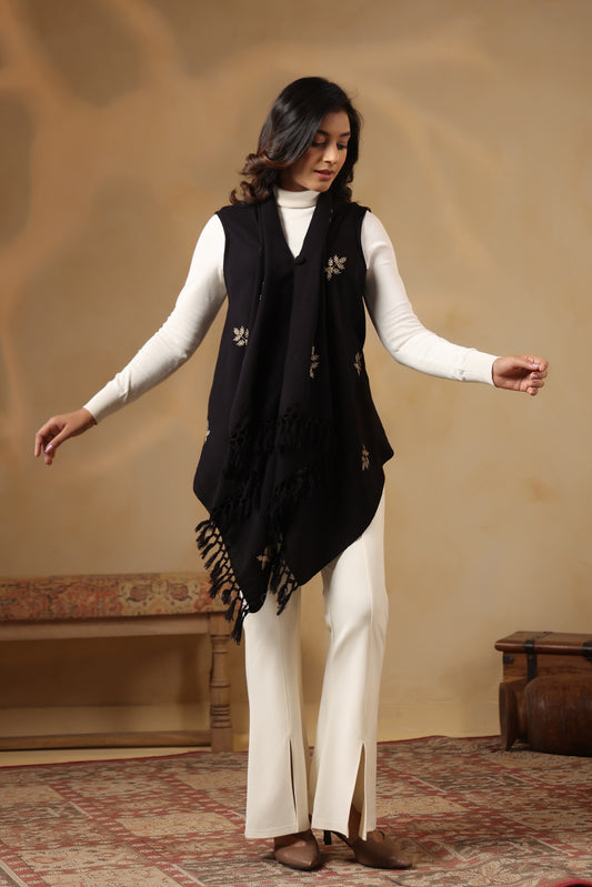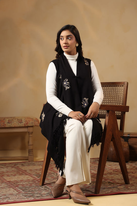 Women's Sleeveless Floral Zari Embroidery Shrug Cardigan | Black