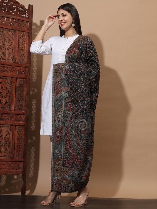 Woven Stole for Women with Daur Border in Woollen Kashmiri Design | Black