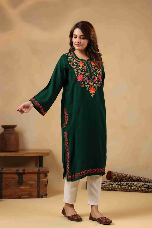 Multicolor Aari Embroidery Kashmiri Pheran | Green
