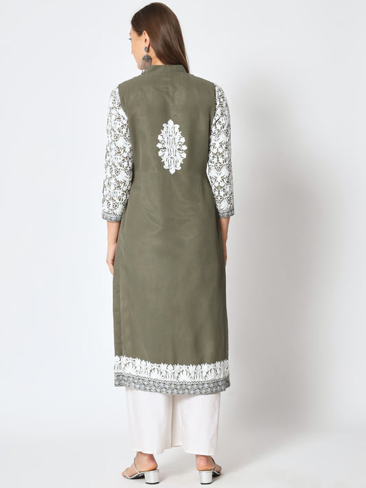 Unstitched Kurta in Faux Georgette with Aari Embroidery (without lining) | Olive Green