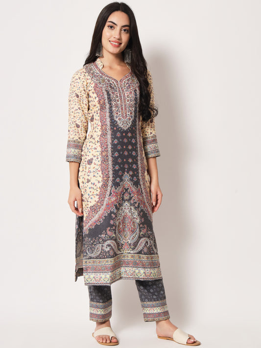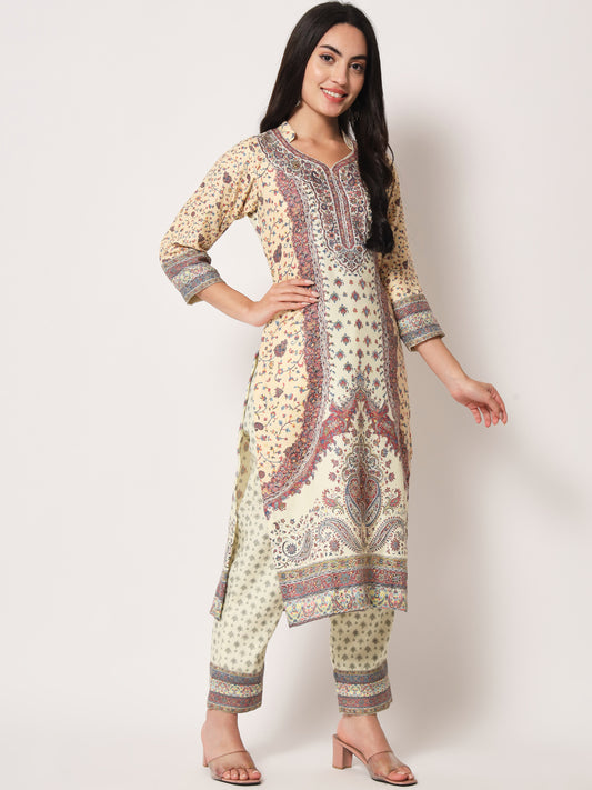 Unstitched Printed Design Kalamkari Handwork Dress Material | Cream