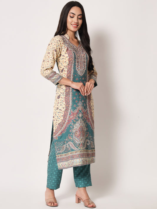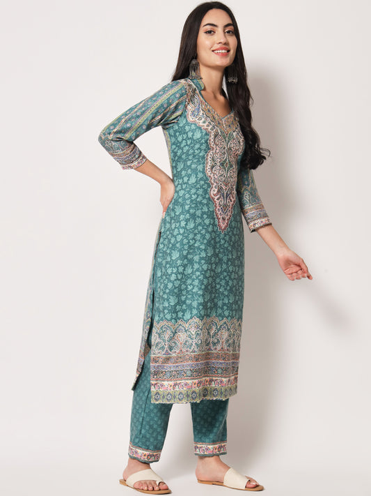 Unstitched Printed Design Kalamkari Handwork Dress Material | Seagreen