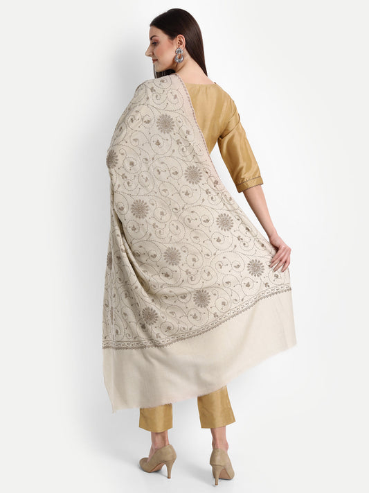 Fine Sozni Jaal Embroidery Kashmiri Wool Shawl | Cream