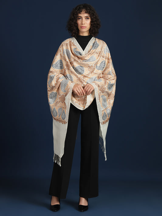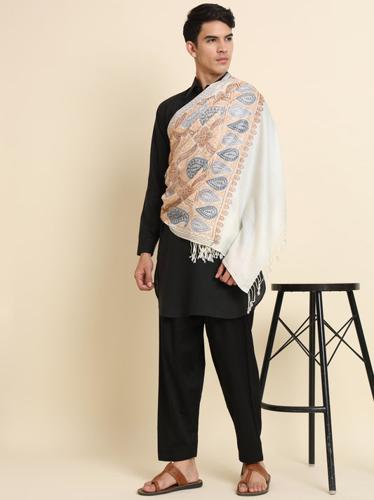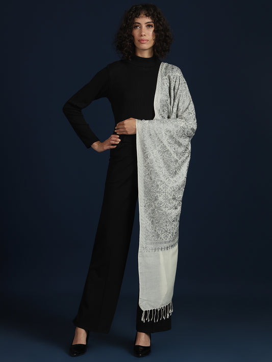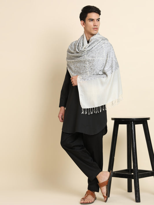 Woollen Pashmina Feel Royal Stole in Silk Embroidery Dense Jaal for Men | White-Grey