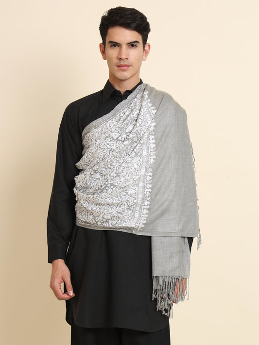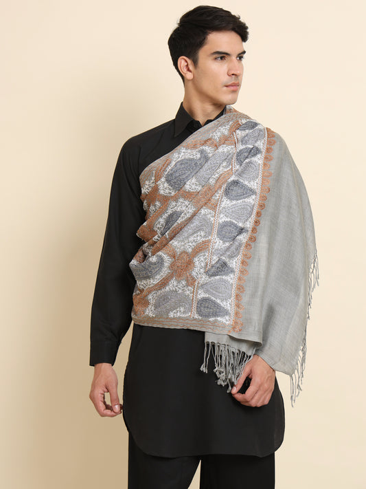 Woollen Pashmina Feel Royal Stole in Silk Embroidery Dense Jaal for Men | Grey