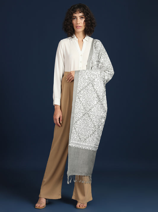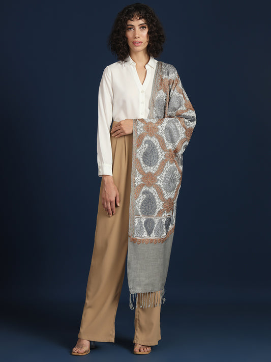 Woollen Pashmina Feel Stole in Silk Embroidery Dense Jaal for Women | Grey
