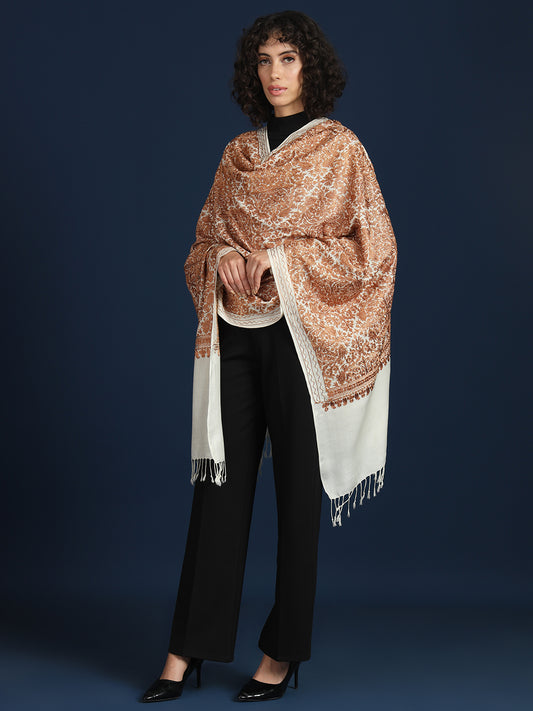 Woollen Pashmina Feel Royal Stole in Silk Embroidery Dense Jaal for Men | Brown-White