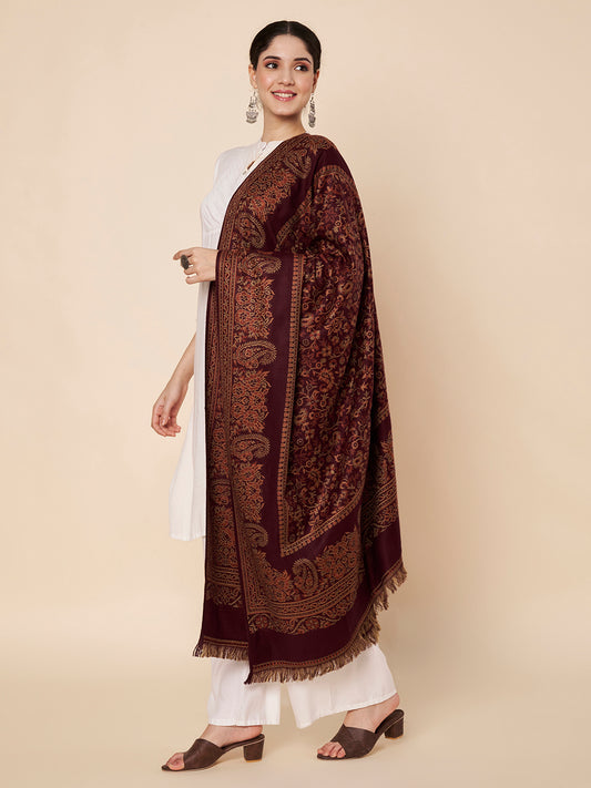 Woollen Kani Shawl with Traditional Kashmiri Floral & Paisley Woven Design | Maroon