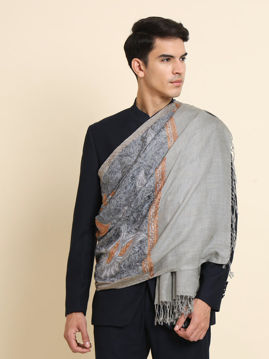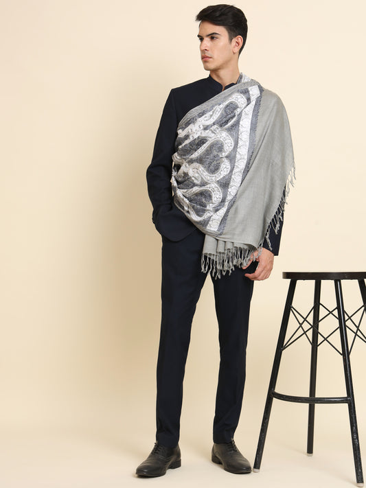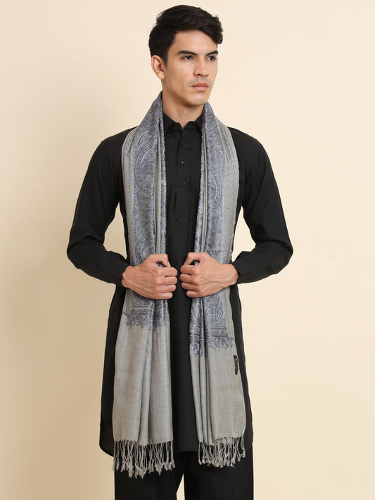 Woollen Pashmina Feel Stole in Silk Embroidery for Men | Grey