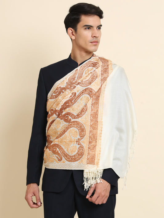Woollen Pashmina Feel Stole in Silk Embroidery for Men | White