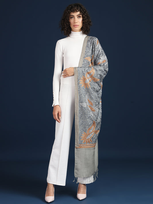 Woollen Pashmina Feel Stole in Silk Embroidery for Women | Grey