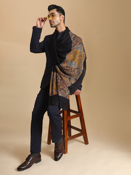 Kani Weave Paisley Border Pure Wool Stole for Men | Black