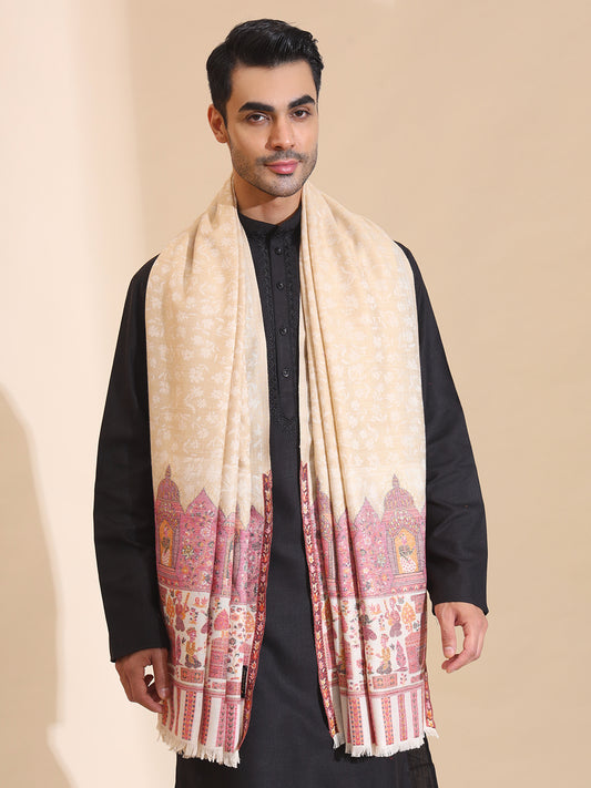 Kani Weave Mughal Border Pure Wool Shawl for Men | Off White