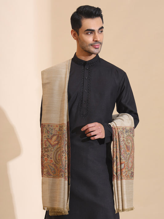 Kani Weave Woven Shawl for Men in Floral Patterns | Black
