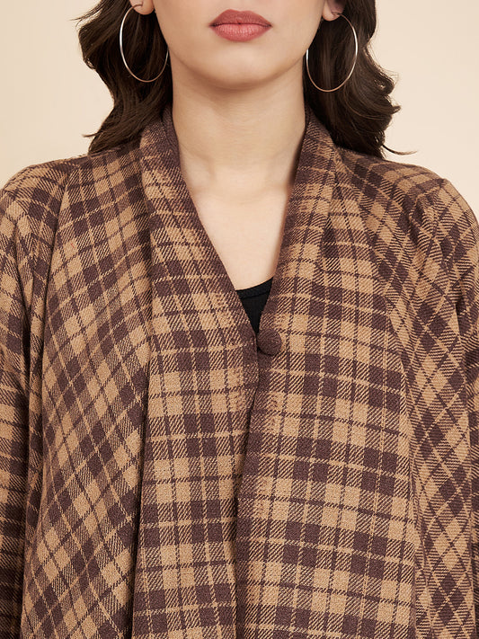 Women's Woven Full Sleeves Cape Shrug in Checked Pattern | Brown