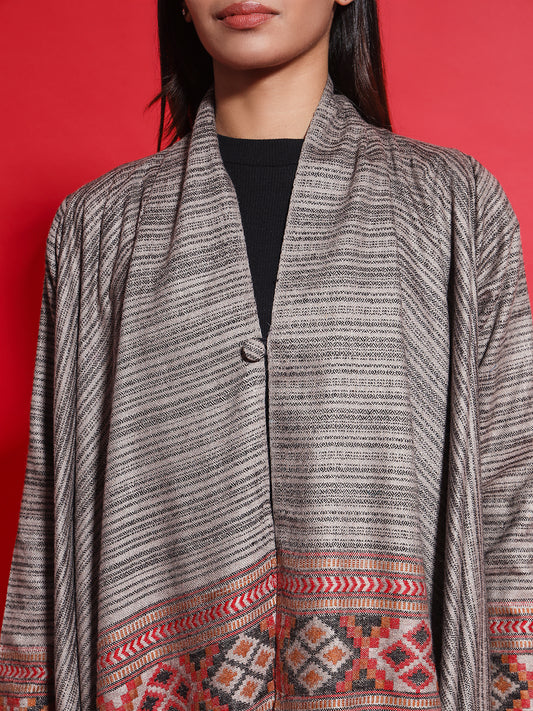 Women's Woven Full Sleeves Cape Shrug in Himalayan Stripes | Grey