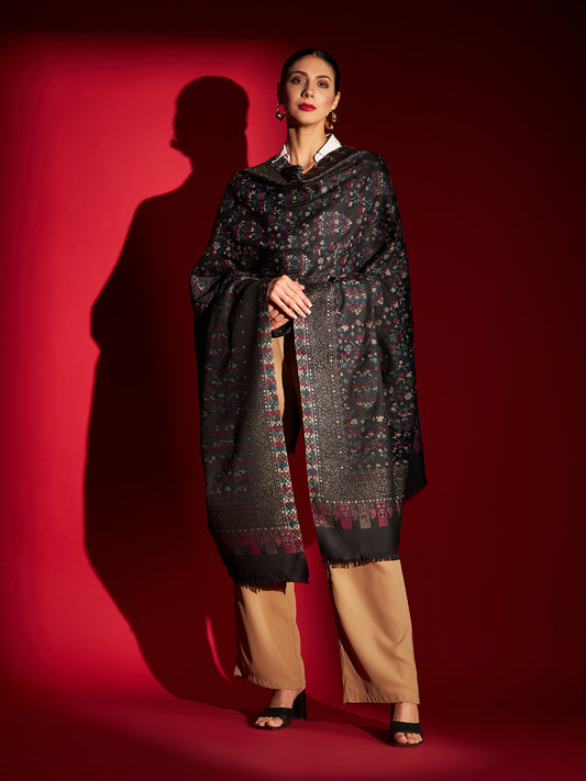 Woollen Pashmina Feel Stole in Silk Embroidery for Women | Black