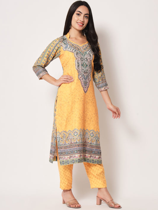 Unstitched Printed Design Kalamkari Handwork Dress Material | Mustard