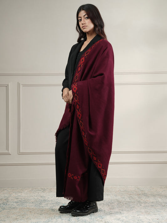 Woollen Plain Kullu Warm Shawl with Border Design | Maroon