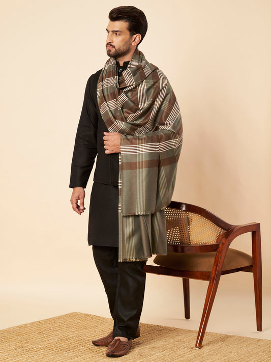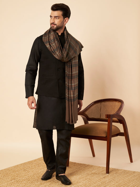 Men's Woollen Lohi Shawl | Grey Brown Stripe Check