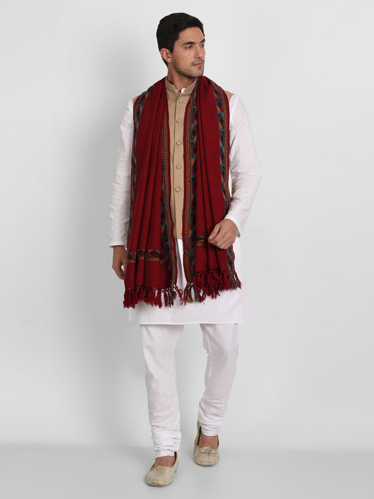 Kani Weave Paisley Border Pure Wool Stole for Men | Maroon