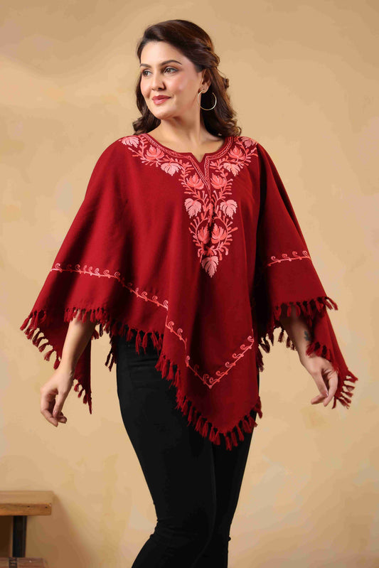 Woollen Poncho Top with Kashmiri Chinar Neck Hand Embroidery and Inner Lining | Maroon